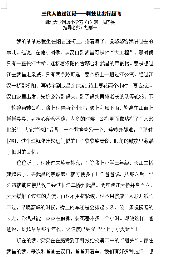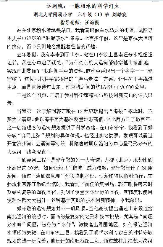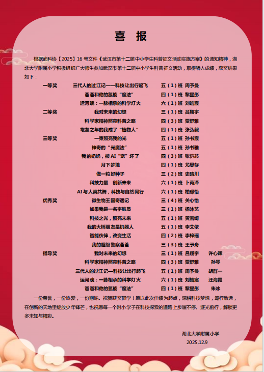 根据武科协【2025】16号文件《武汉市第十二届中小学生科普征文活动实施方案》的通知精神,湖北大学附属小学依托深厚的科普教育积淀,积极响应活动号召,广泛动员全校学生参与创作,以文字为桥,搭建起青少年探索科学奥秘、抒发创新梦想的展示平台,取得骄人成绩,获奖结果如下: