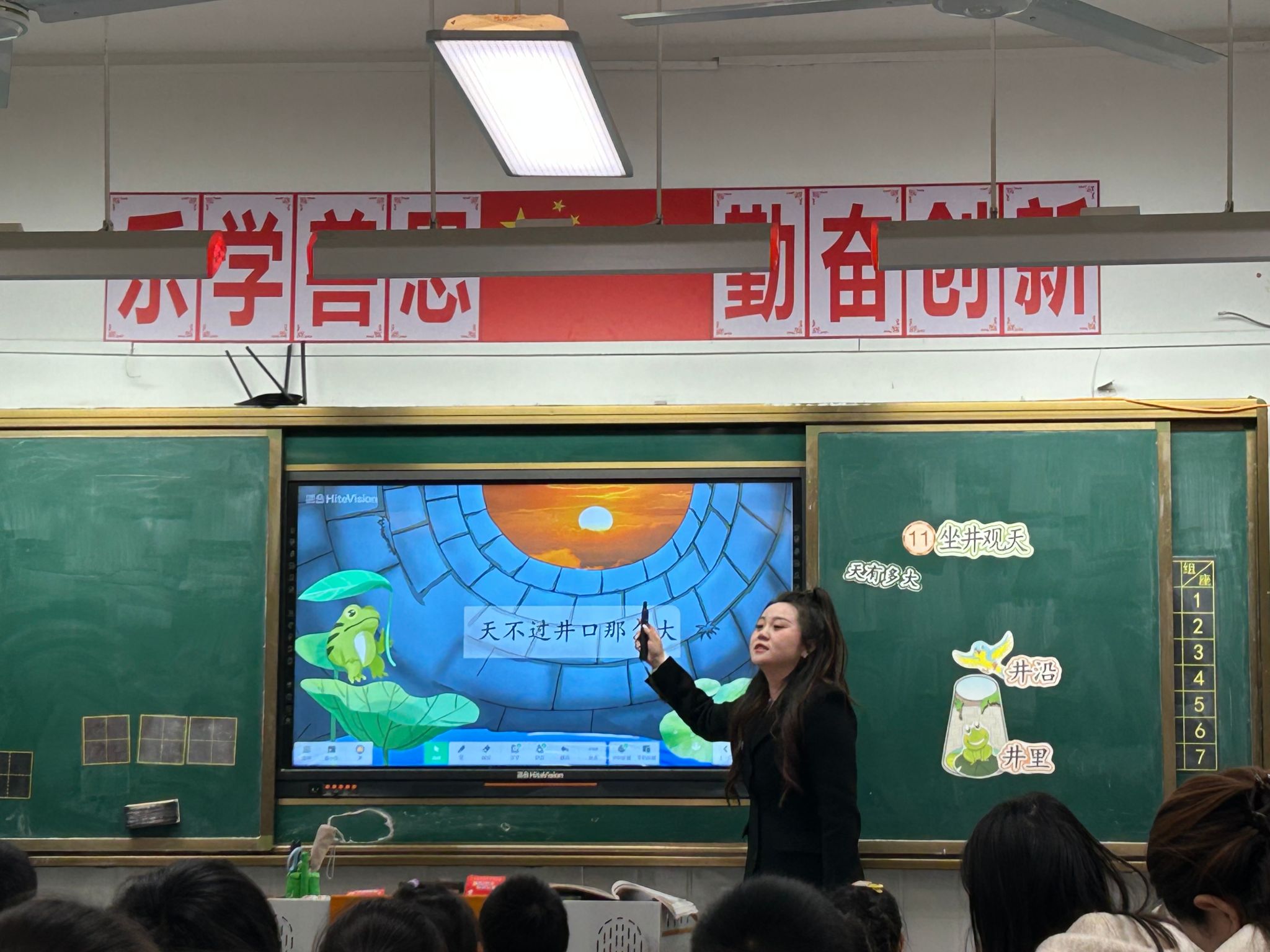 12月12日下午,樊佳琪老师在二(3)班执教了寓言故事《坐井观天》。本节课以学生为主体,立足学习任务群理念,围绕“天有多大”纠纷案设计四环节教学:一是以板书+“开小火车”回顾案情、复习旧知;二是聚焦三次对话探秘案发现场,结合生活感知、词语语气体会与角色心理渗透开展朗读指导;三是通过分层设计,以“结案陈词”突破重难点、领悟寓言道理;四是以“青蛙与小鸟的笑”为切入点续编故事,读写结合巩固字词、提升朗读,渗透“站得高看得远”的道理,培养探索思维。