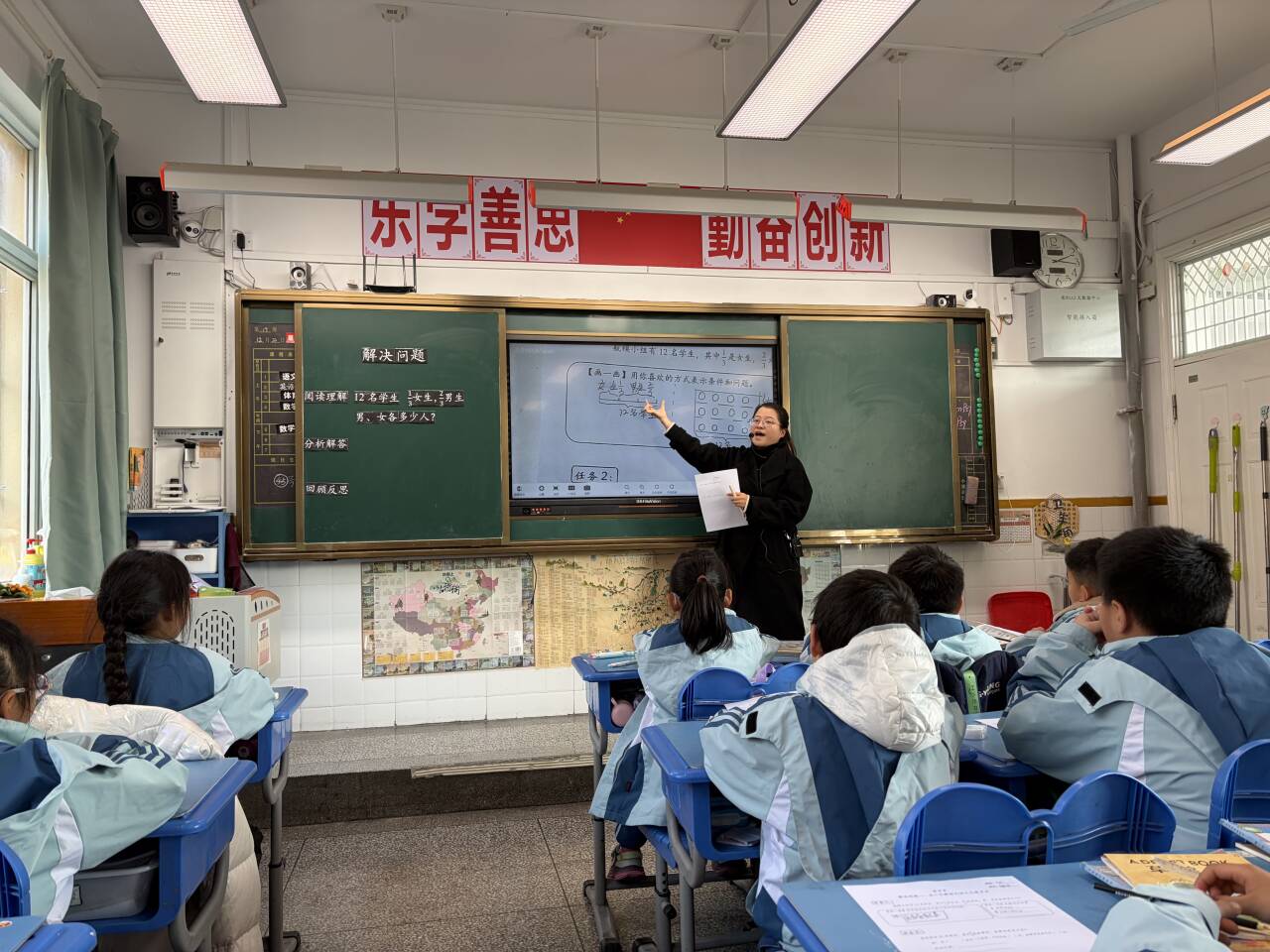 12月26日,苏秀秀老师执教《解决问题》,与三(4)班学生共同呈现了一节充满启发性的数学课堂。教师以伞的占比回忆分数含义切入新课,按“任务一扶学—任务二尝试—任务三闯关练习”推进,围绕“阅读理解—分析解答—回顾反思”解题法层层递进,既让学生学会解题,更掌握数学思考方法。教师紧扣学习难点,通过圆圈、长方形、线段图等多种图表征数量关系,将抽象分数问题具象化,引导学生用数学眼光发现、语言表达、思维思考,在观察与表达中培养严谨习惯,直观理解“求一个数的几分之几是多少”的算理,以几何直观为分析工具,有效突破“分数含义转化为乘除法意义”的教学重点。