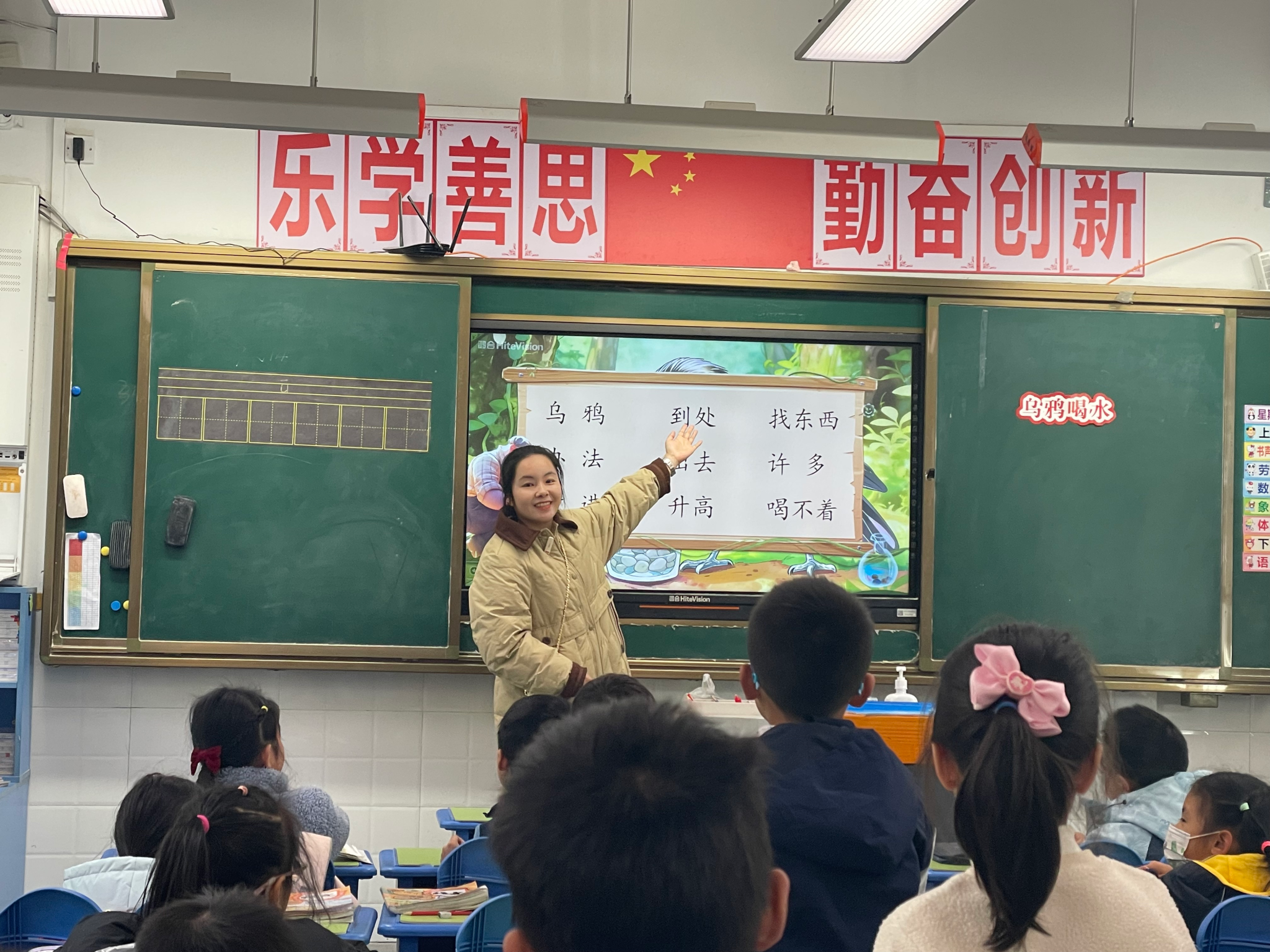 12 月 26 日下午,李圣君老师在一(3)班执教了寓言故事《乌鸦喝水》。教师以学生为主体,围绕“小乌鸦的喝水妙计”设计四环节递进教学:一是开小火车复习生字词,回顾乌鸦喝水困境,做好探究铺垫;二是聚焦喝水妙计,通过朗读感悟、数量感知、实验+视频直观理解“渐渐”,实现语文与科学跨学科融合;三是以问题驱动小组讨论,鼓励学生想替代办法,总结故事道理,进阶领悟智慧;四是书写“多”字,落实低段识字写字目标,渗透迎难而上、积极动脑的道理,培养创新思维与实践能力。